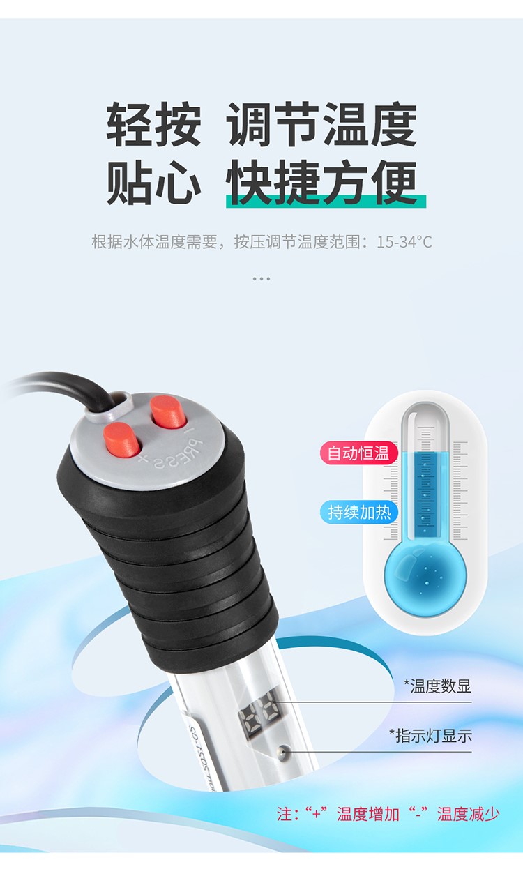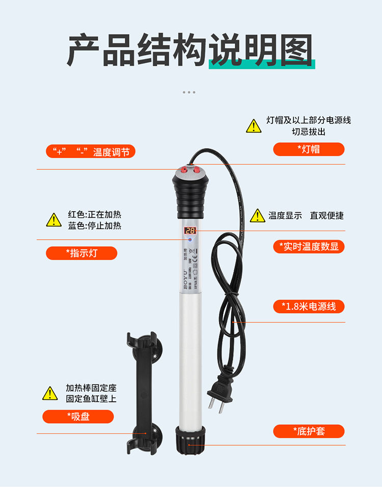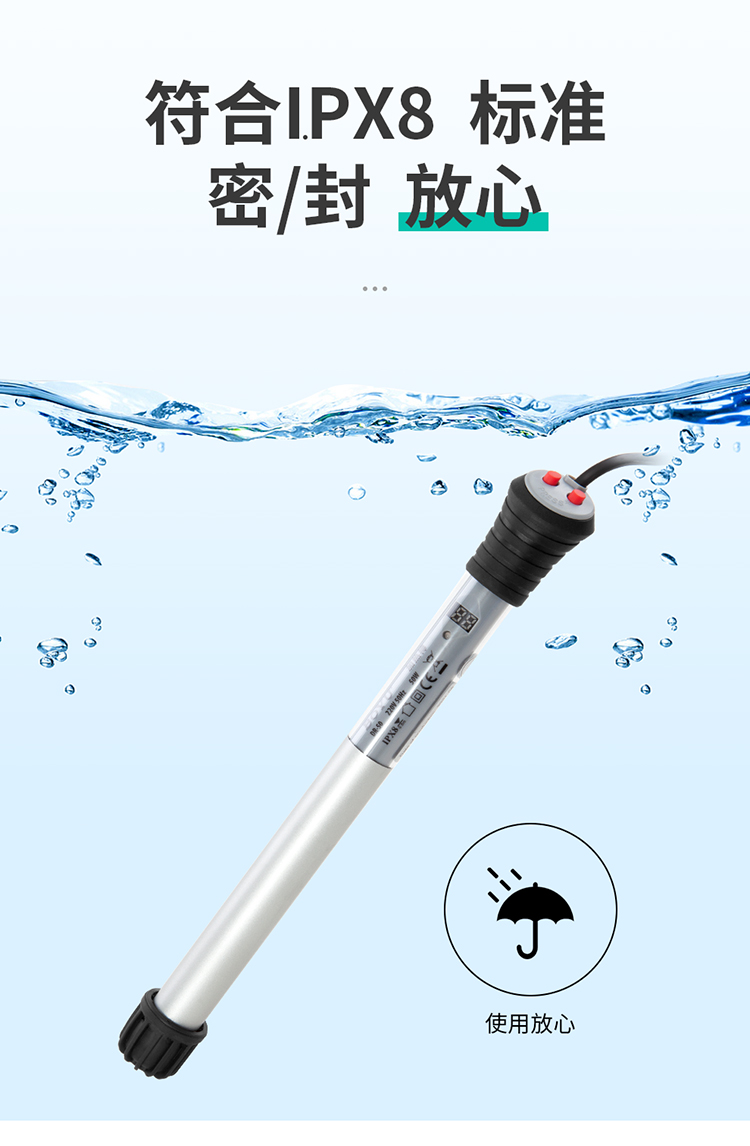 • 加熱棒采用防爆耐熱玻璃管,具有溫度計與加溫器的功能,安全性高,發熱速度快等特點。